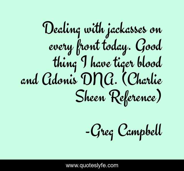 This page presents the quote "Dealing with jackasses on every front today. Good thing I have tiger blood and Adonis DNA. (Charlie Sheen Reference)". Author of this quote is Greg Campbell. This quote is about humor, fighting, everyday-life, dealing-with-idiots, vailiancy, dealing-with-people, stupid-people,.