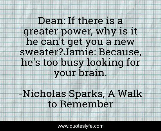 This page presents the quote "Dean: If there is a greater power, why is it he can't get you a new sweater?Jamie: Because, he's too busy looking for your brain.". Author of this quote is Nicholas Sparks, A Walk to Remember. .