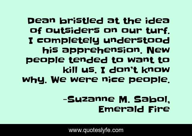 This page presents the quote "Dean bristled at the idea of outsiders on our turf. I completely understood his apprehension. New people tended to want to kill us. I don’t know why. We were nice people.". Author of this quote is Suzanne M. Sabol, Emerald Fire. This quote is about werewolves, vampires, paranormal-romance, contemporary,.