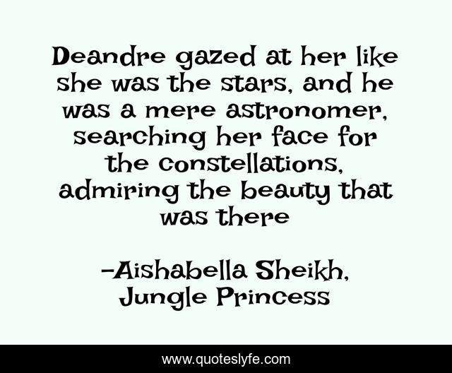 This page presents the quote "Deandre gazed at her like she was the stars, and he was a mere astronomer, searching her face for the constellations, admiring the beauty that was there". Author of this quote is Aishabella Sheikh, Jungle Princess. This quote is about love, beauty, amarissa, constellations, astronomer, stars, deandre, affection,.
