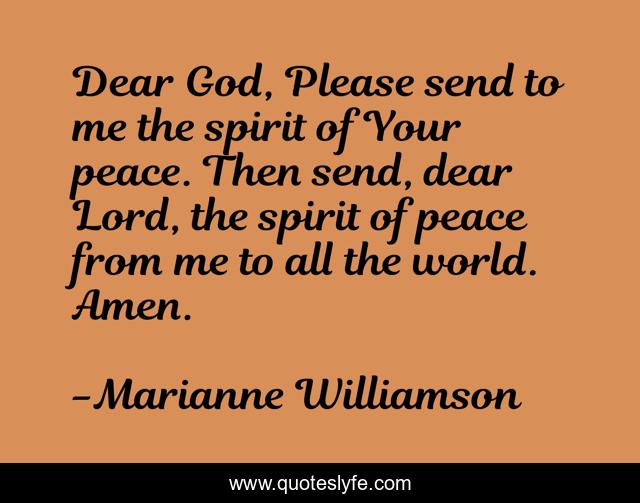 This page presents the quote "Dear God, Please send to me the spirit of Your peace. Then send, dear Lord, the spirit of peace from me to all the world. Amen.". Author of this quote is Marianne Williamson. This quote is about me, god, world,.