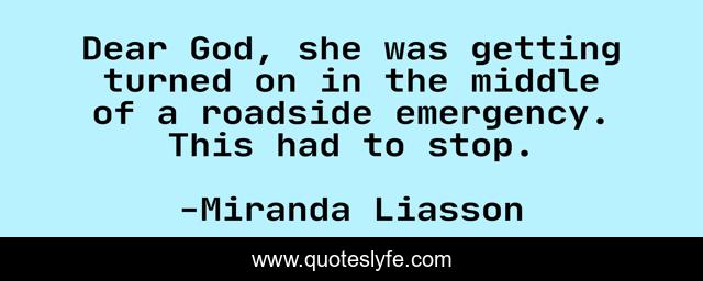 This page presents the quote "Dear God, she was getting turned on in the middle of a roadside emergency. This had to stop.". Author of this quote is Miranda Liasson. This quote is about series-romance, enemies-to-lovers, contemporary-romance, lighthearted,.