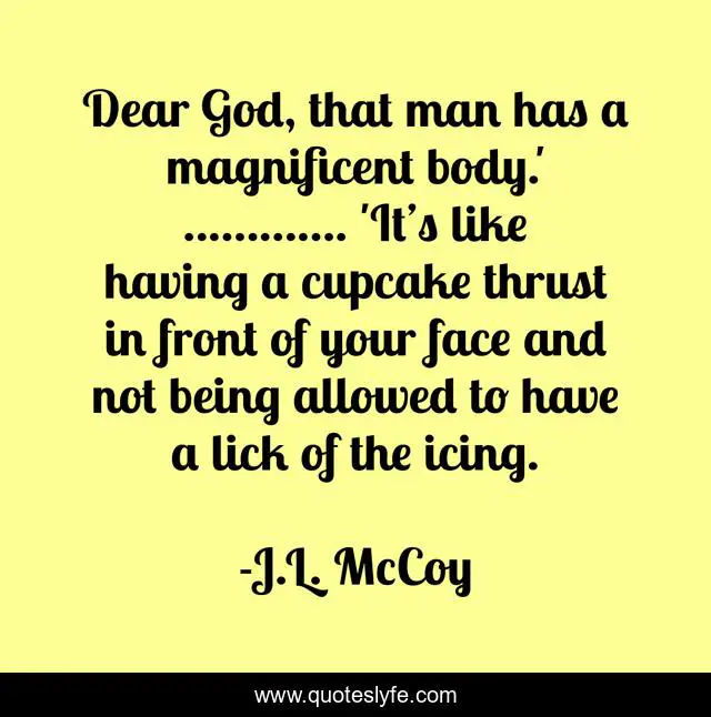 This page presents the quote "Dear God, that man has a magnificent body.' ............. 'It’s like having a cupcake thrust in front of your face and not being allowed to have a lick of the icing.". Author of this quote is J.L. McCoy. This quote is about lust, humor, vampire,.