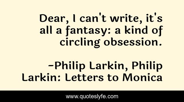 This page presents the quote "Dear, I can't write, it's all a fantasy: a kind of circling obsession.". Author of this quote is Philip Larkin, Philip Larkin: Letters to Monica. This quote is about poetry, letters, philip-larkin, letters-to-monica, writing,.
