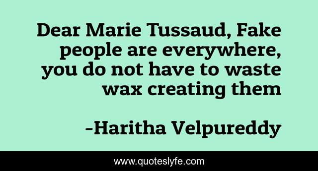 This page presents the quote "Dear Marie Tussaud, Fake people are everywhere, you do not have to waste wax creating them". Author of this quote is Haritha Velpureddy. This quote is about witty, enthusiasm, inspirational,.