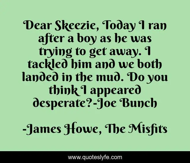 This page presents the quote "Dear Skeezie, Today I ran after a boy as he was trying to get away. I tackled him and we both landed in the mud. Do you think I appeared desperate?-Joe Bunch". Author of this quote is James Howe, The Misfits. .