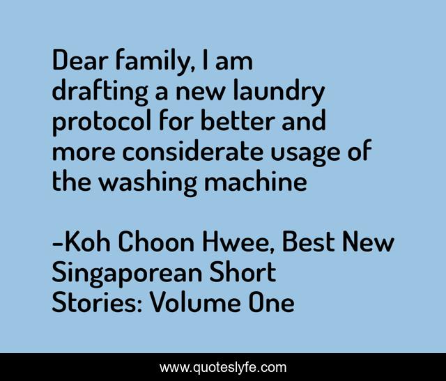 This page presents the quote "Dear family, I am drafting a new laundry protocol for better and more considerate usage of the washing machine". Author of this quote is Koh Choon Hwee, Best New Singaporean Short Stories: Volume One. This quote is about fiction, short-stories, literature, singapore,.