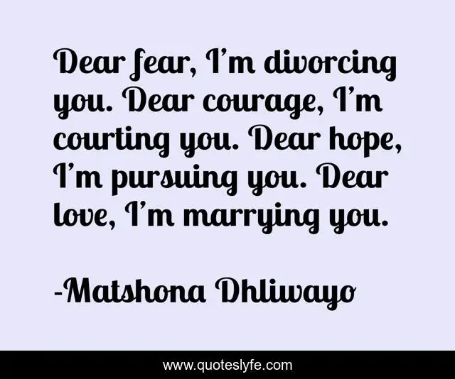 "Matshona Dhliwayo Quotes." Quoteslyfe.com, 2025. Sat. 06 Dec. 2025. <https://www.quoteslyfe.com/quote/Dear-fear-I-m-divorcing-you-Dear-49378>.