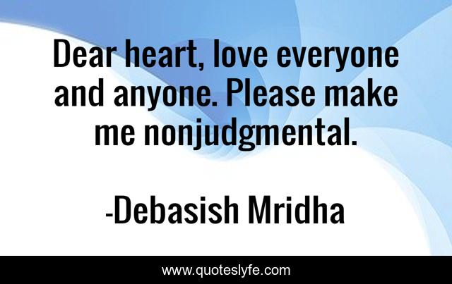 This page presents the quote "Dear heart, love everyone and anyone. Please make me nonjudgmental.". Author of this quote is Debasish Mridha. This quote is about life, love, knowledge, inspirational, intelligence, philosophy, wisdom, quotes, affection,.