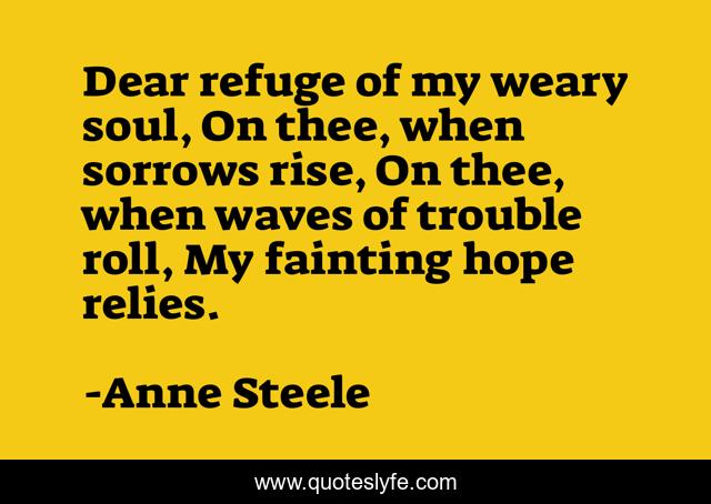This page presents the quote "Dear refuge of my weary soul, On thee, when sorrows rise, On thee, when waves of trouble roll, My fainting hope relies.". Author of this quote is Anne Steele. This quote is about sorrow, hope, refuge,.