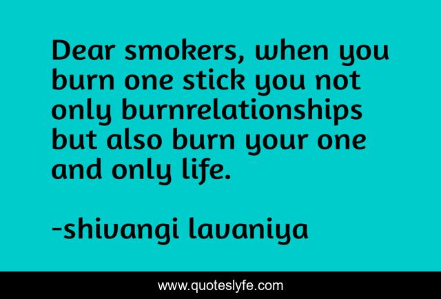 This page presents the quote "Dear smokers, when you burn one stick you not only burnrelationships but also burn your one and only life.". Author of this quote is shivangi lavaniya. This quote is about life, burn, smoker, relationship,.