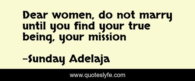 This page presents the quote "Dear women, do not marry until you find your true being, your mission". Author of this quote is Sunday Adelaja. This quote is about family, wife, mission, calling, marriage, purpose, women,.