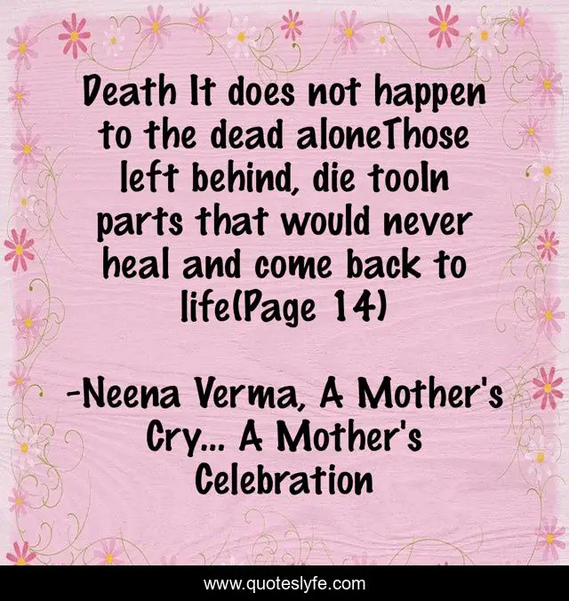 This page presents the quote "Death It does not happen to the dead aloneThose left behind, die tooIn parts that would never heal and come back to life(Page 14)". Author of this quote is Neena Verma, A Mother's Cry... A Mother's Celebration. This quote is about die, heal, death, life,.