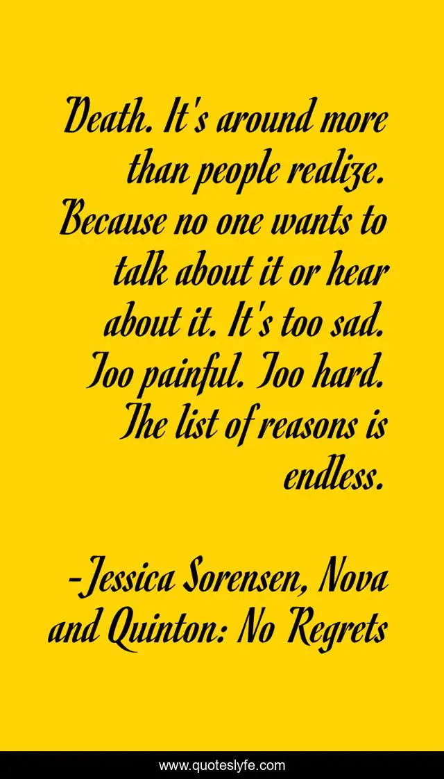 This page presents the quote "Death. It's around more than people realize. Because no one wants to talk about it or hear about it. It's too sad. Too painful. Too hard. The list of reasons is endless.". Author of this quote is Jessica Sorensen, Nova and Quinton: No Regrets. This quote is about death-and-dying, death-of-a-loved-one,.