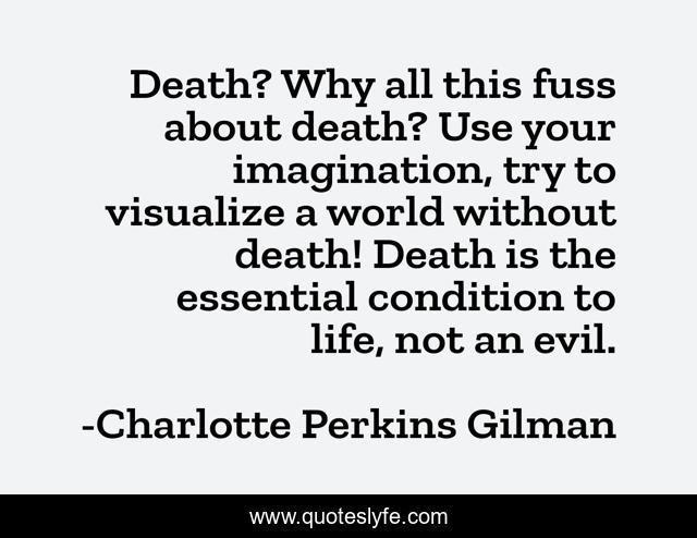 This page presents the quote "Death? Why all this fuss about death? Use your imagination, try to visualize a world without death! Death is the essential condition to life, not an evil.". Author of this quote is Charlotte Perkins Gilman. .