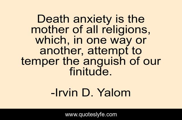 This page presents the quote "Death anxiety is the mother of all religions, which, in one way or another, attempt to temper the anguish of our finitude.". Author of this quote is Irvin D. Yalom. This quote is about grief, counseling, staring-at-the-sun, death-anxiety, psychology,.