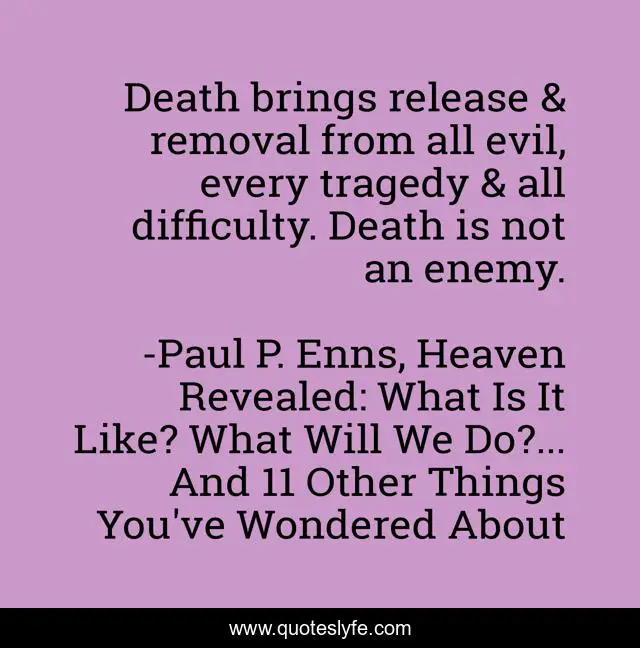 "Paul P. Enns, Heaven Revealed: What Is It Like? What Will We Do?... And 11 Other Things You've Wondered About Quotes." Quoteslyfe.com, 2025. Mon. 08 Dec. 2025. <https://www.quoteslyfe.com/quote/Death-brings-release-removal-from-all-evil-183437>.