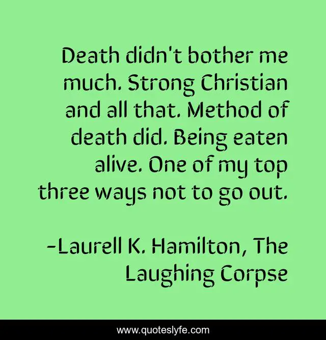 This page presents the quote "Death didn't bother me much. Strong Christian and all that. Method of death did. Being eaten alive. One of my top three ways not to go out.". Author of this quote is Laurell K. Hamilton, The Laughing Corpse. This quote is about death, humor,.