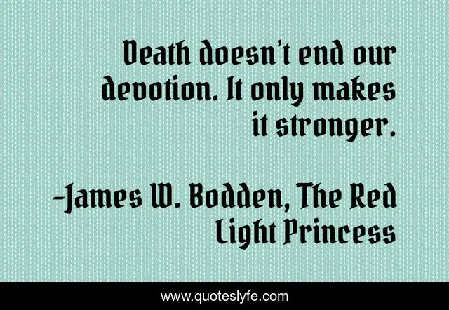 This page presents the quote "Death doesn’t end our devotion. It only makes it stronger.". Author of this quote is James W. Bodden, The Red Light Princess. This quote is about death, end, devotion, love, final, affection,.