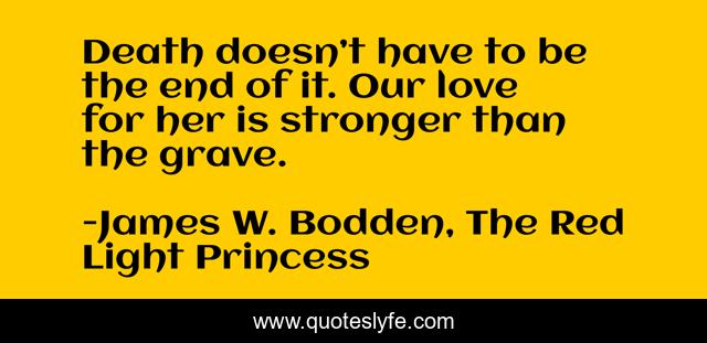 This page presents the quote "Death doesn’t have to be the end of it. Our love for her is stronger than the grave.". Author of this quote is James W. Bodden, The Red Light Princess. This quote is about death, love, celebrity, murder, celebrity-worship, affection, prostitute,.