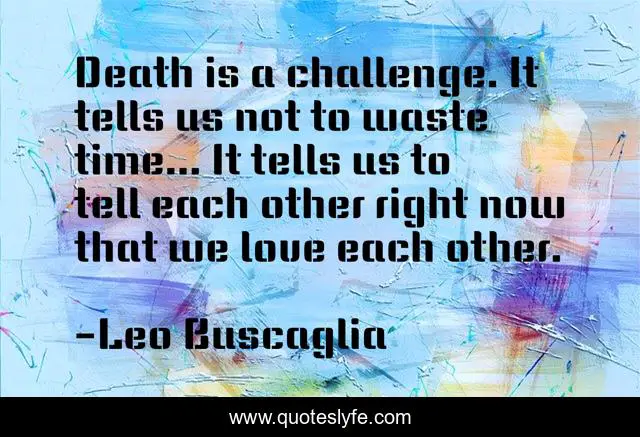 This page presents the quote "Death is a challenge. It tells us not to waste time... It tells us to tell each other right now that we love each other.". Author of this quote is Leo Buscaglia. This quote is about challenge, love, affection, time,.