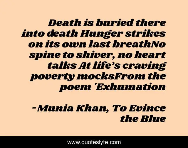 This page presents the quote "Death is buried there into death Hunger strikes on its own last breathNo spine to shiver, no heart talks At life’s craving poverty mocksFrom the poem 'Exhumation". Author of this quote is Munia Khan, To Evince the Blue. This quote is about heart, life, death, hunger, spine, poem, dead, poetry, craving,.