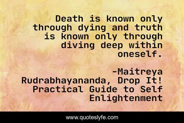 This page presents the quote "Death is known only through dying and truth is known only through diving deep within oneself.". Author of this quote is Maitreya Rudrabhayananda, Drop It! Practical Guide to Self Enlightenment. This quote is about death, oneself, dying, within-you, truth, diving, truth-of-life,.