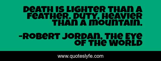 This page presents the quote "Death is lighter than a feather. Duty, heavier than a mountain.". Author of this quote is Robert Jordan, The Eye of the World. This quote is about fantasy-literature, fantasy-fiction,.