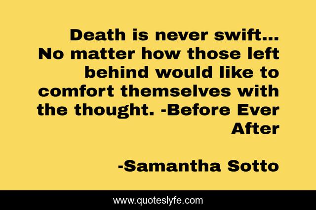 This page presents the quote "Death is never swift... No matter how those left behind would like to comfort themselves with the thought. -Before Ever After". Author of this quote is Samantha Sotto. This quote is about before-ever-after, death, life,.