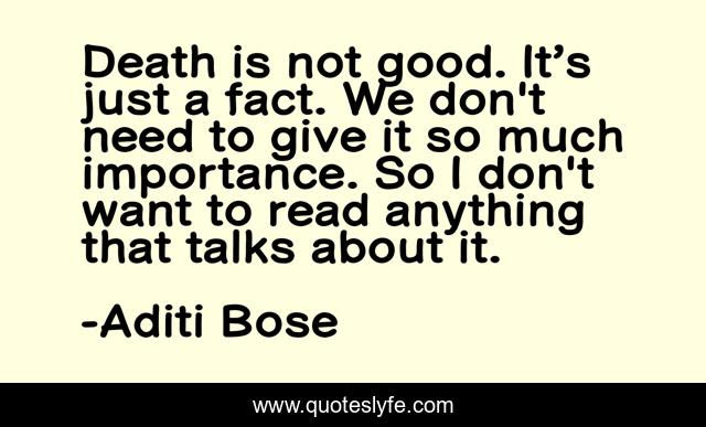 This page presents the quote "Death is not good. It’s just a fact. We don't need to give it so much importance. So I don't want to read anything that talks about it.". Author of this quote is Aditi Bose. This quote is about love, romance, life-lessons, life-philosophy, death-and-dying, affection,.