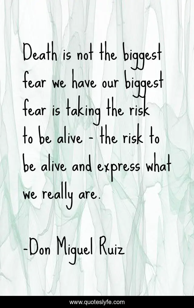 This page presents the quote "Death is not the biggest fear we have our biggest fear is taking the risk to be alive - the risk to be alive and express what we really are.". Author of this quote is Don Miguel Ruiz. This quote is about fear, risk, alive,.