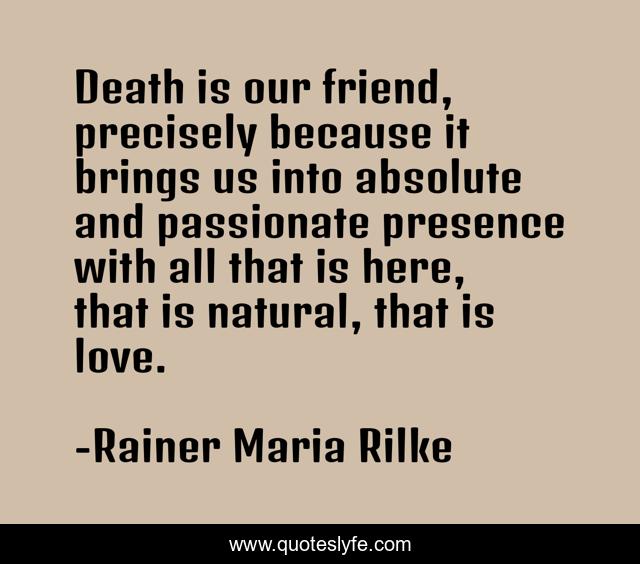 This page presents the quote "Death is our friend, precisely because it brings us into absolute and passionate presence with all that is here, that is natural, that is love.". Author of this quote is Rainer Maria Rilke. This quote is about death-and-love, death, death-and-dying,.