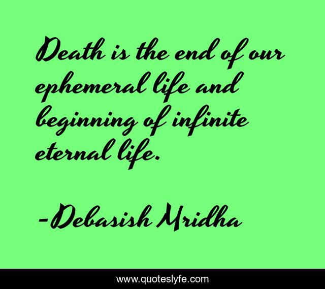This page presents the quote "Death is the end of our ephemeral life and beginning of infinite eternal life.". Author of this quote is Debasish Mridha. This quote is about ephemeral-life, death, beginning-of-eternal-life, debasish, debasish-mridha, endings-and-beginnings, eternal-life, mridha, philosophy,.