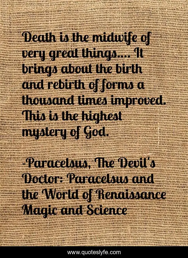 "Paracelsus, The Devil's Doctor: Paracelsus and the World of Renaissance Magic and Science Quotes." Quoteslyfe.com, 2025. Sat. 06 Dec. 2025. <https://www.quoteslyfe.com/quote/Death-is-the-midwife-of-very-great-146341>.