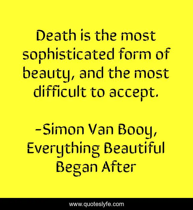 This page presents the quote "Death is the most sophisticated form of beauty, and the most difficult to accept.". Author of this quote is Simon Van Booy, Everything Beautiful Began After. This quote is about life, death,.