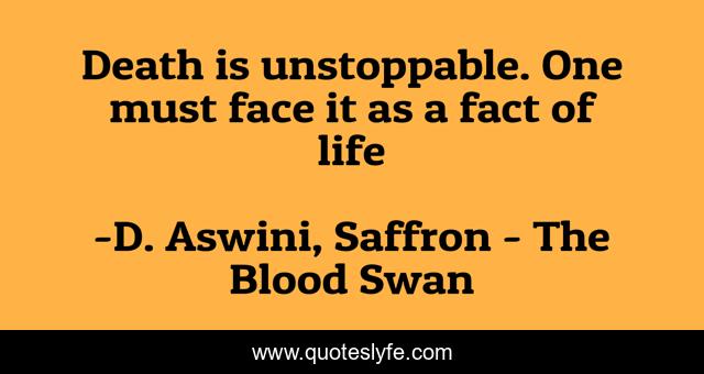 This page presents the quote "Death is unstoppable. One must face it as a fact of life". Author of this quote is D. Aswini, Saffron - The Blood Swan. This quote is about fantasy, death, hope, truth,.