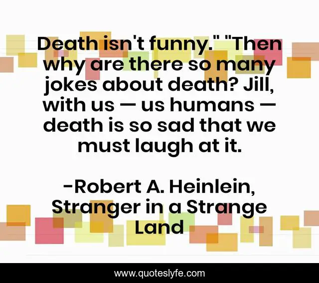 This page presents the quote "Death isn't funny." "Then why are there so many jokes about death? Jill, with us — us humans — death is so sad that we must laugh at it.". Author of this quote is Robert A. Heinlein, Stranger in a Strange Land. .