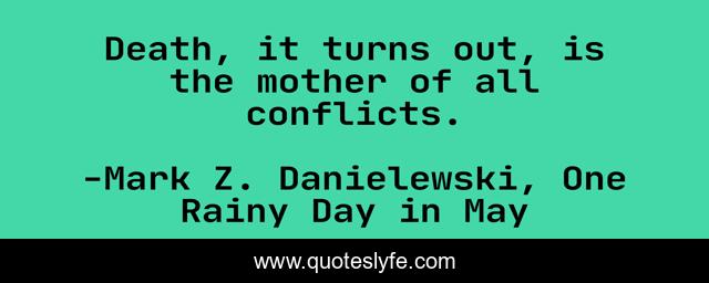 This page presents the quote "Death, it turns out, is the mother of all conflicts.". Author of this quote is Mark Z. Danielewski, One Rainy Day in May. This quote is about death, death-and-dying, war,.