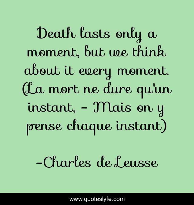 This page presents the quote "Death lasts only a moment, but we think about it every moment. (La mort ne dure qu'un instant, - Mais on y pense chaque instant)". Author of this quote is Charles de Leusse. This quote is about moment, death, mort,.