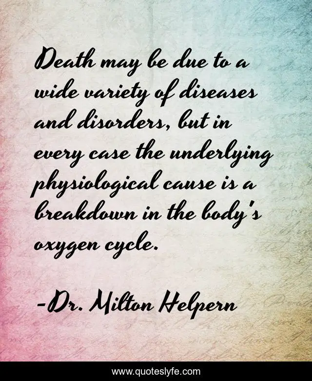 This page presents the quote "Death may be due to a wide variety of diseases and disorders, but in every case the underlying physiological cause is a breakdown in the body's oxygen cycle.". Author of this quote is Dr. Milton Helpern. This quote is about medicine, death, disease,.