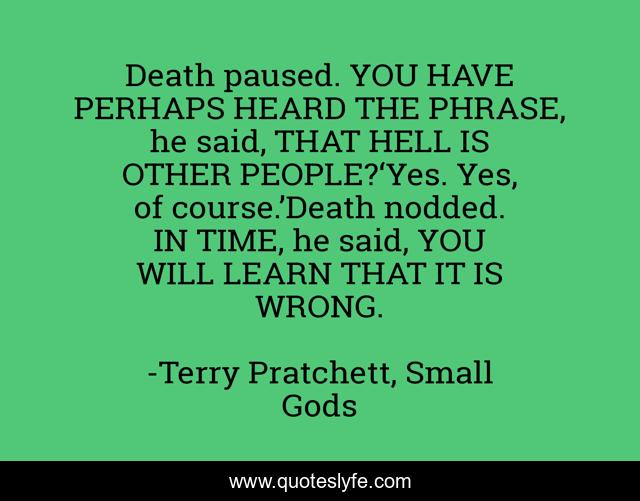 This page presents the quote "Death paused. YOU HAVE PERHAPS HEARD THE PHRASE, he said, THAT HELL IS OTHER PEOPLE?‘Yes. Yes, of course.’Death nodded. IN TIME, he said, YOU WILL LEARN THAT IT IS WRONG.". Author of this quote is Terry Pratchett, Small Gods. This quote is about life, death, people, small-gods, discworld, life-philosophy,.