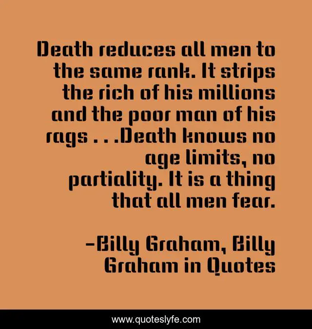 This page presents the quote "Death reduces all men to the same rank. It strips the rich of his millions and the poor man of his rags . . .Death knows no age limits, no partiality. It is a thing that all men fear.". Author of this quote is Billy Graham, Billy Graham in Quotes. This quote is about death, billy-graham,.