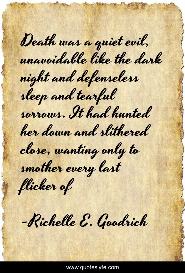 This page presents the quote "Death was a quiet evil, unavoidable like the dark night and defenseless sleep and tearful sorrows. It had hunted her down and slithered close, wanting only to smother every last flicker of". Author of this quote is Richelle E. Goodrich. This quote is about death, darkness, dying, aquarius, safire, richelle, richelle-goodrich, my-aquarius, sleep,.