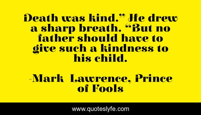 This page presents the quote "Death was kind.” He drew a sharp breath. “But no father should have to give such a kindness to his child.". Author of this quote is Mark Lawrence, Prince of Fools. This quote is about death, kindness, father, child,.