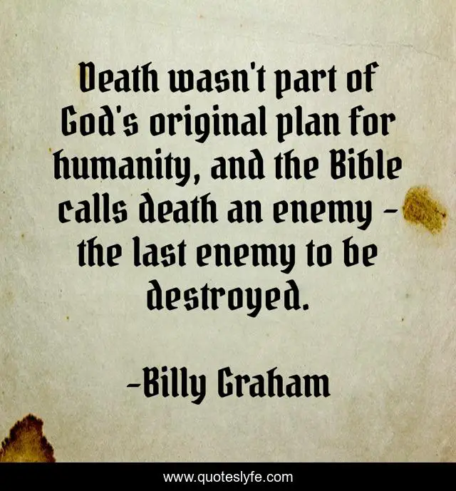 This page presents the quote "Death wasn't part of God's original plan for humanity, and the Bible calls death an enemy - the last enemy to be destroyed.". Author of this quote is Billy Graham. This quote is about god, humanity, plan,.