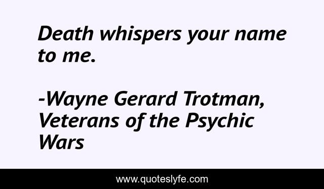 This page presents the quote "Death whispers your name to me.". Author of this quote is Wayne Gerard Trotman, Veterans of the Psychic Wars. This quote is about psychic-powers, death, threats, sci-fi, psychic, science-fiction, death-and-dying, scifi, telepathy,.