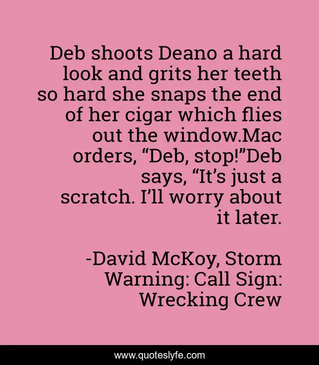 This page presents the quote "Deb shoots Deano a hard look and grits her teeth so hard she snaps the end of her cigar which flies out the window.Mac orders, “Deb, stop!”Deb says, “It’s just a scratch. I’ll worry about it later.". Author of this quote is David McKoy, Storm Warning: Call Sign: Wrecking Crew. .