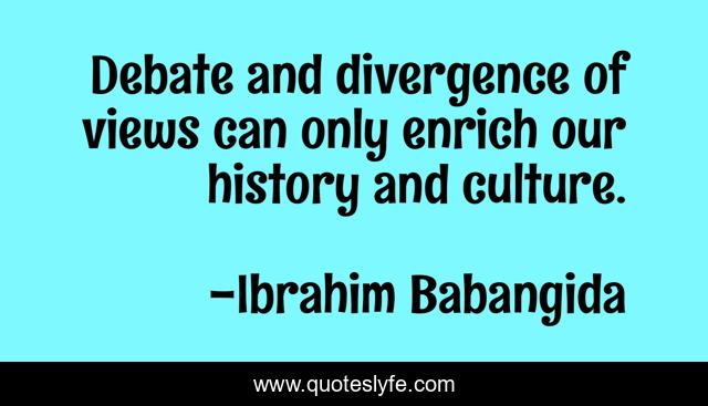 This page presents the quote "Debate and divergence of views can only enrich our history and culture.". Author of this quote is Ibrahim Babangida. This quote is about culture, debate, enrich,.