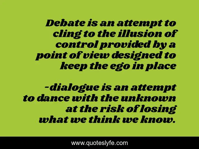 "dialogue is an attempt to dance with the unknown at the risk of losing what we think we know. Quotes." Quoteslyfe.com, 2025. Fri. 05 Dec. 2025. <https://www.quoteslyfe.com/quote/Debate-is-an-attempt-to-cling-to-116809>.