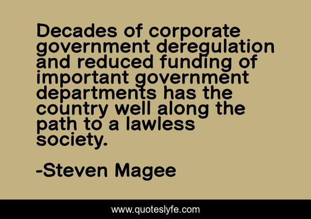 This page presents the quote "Decades of corporate government deregulation and reduced funding of important government departments has the country well along the path to a lawless society.". Author of this quote is Steven Magee. This quote is about funding, usa, government, country, lawless, departments, society, important, deregulation,.
